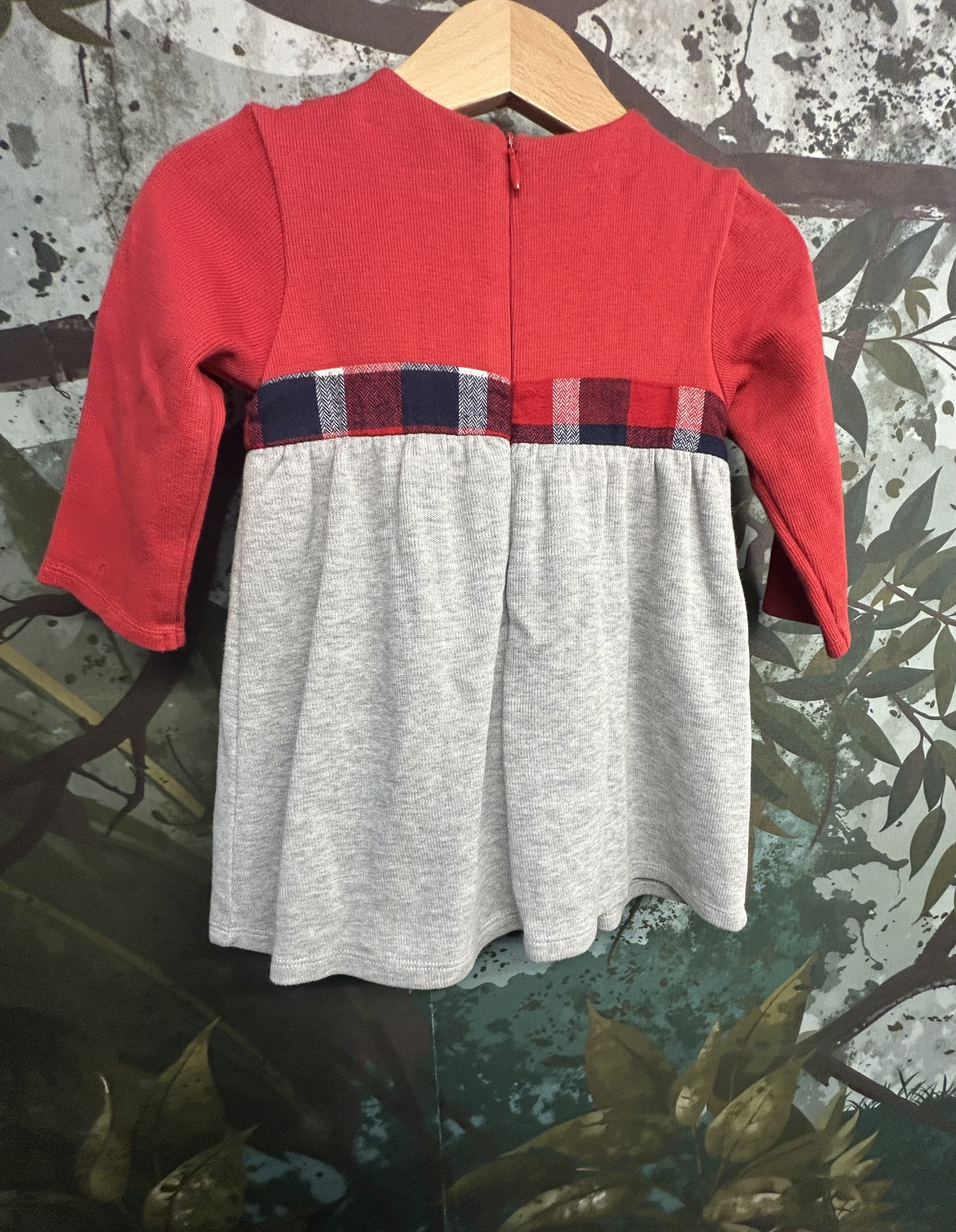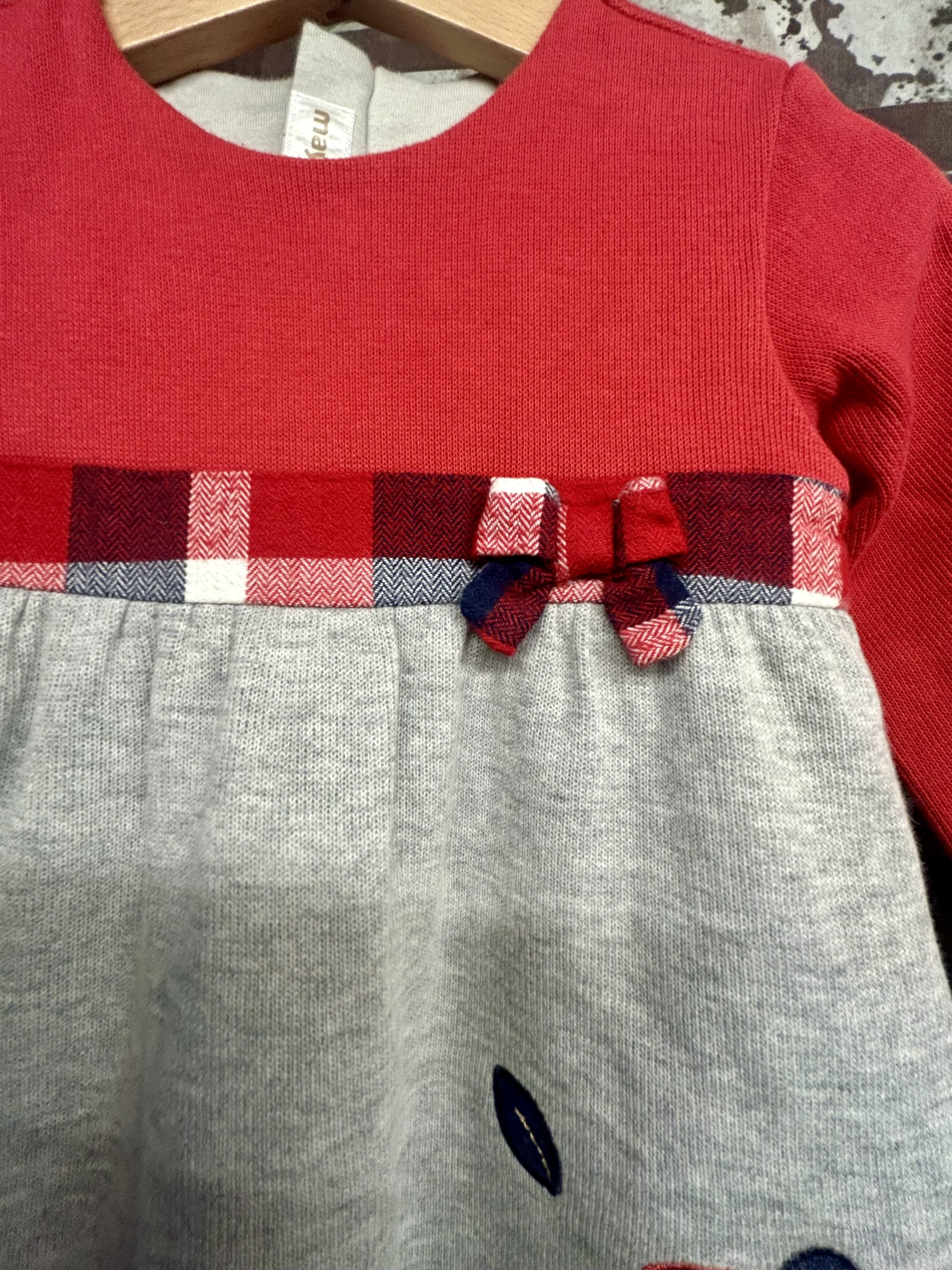 Un modello confortevole e curato nei dettagli, con corpino rosso in maglia leggera, fascia a quadri nei toni del rosso e blu, e gonna grigio chiaro con ricamo applicato di una bambolina.