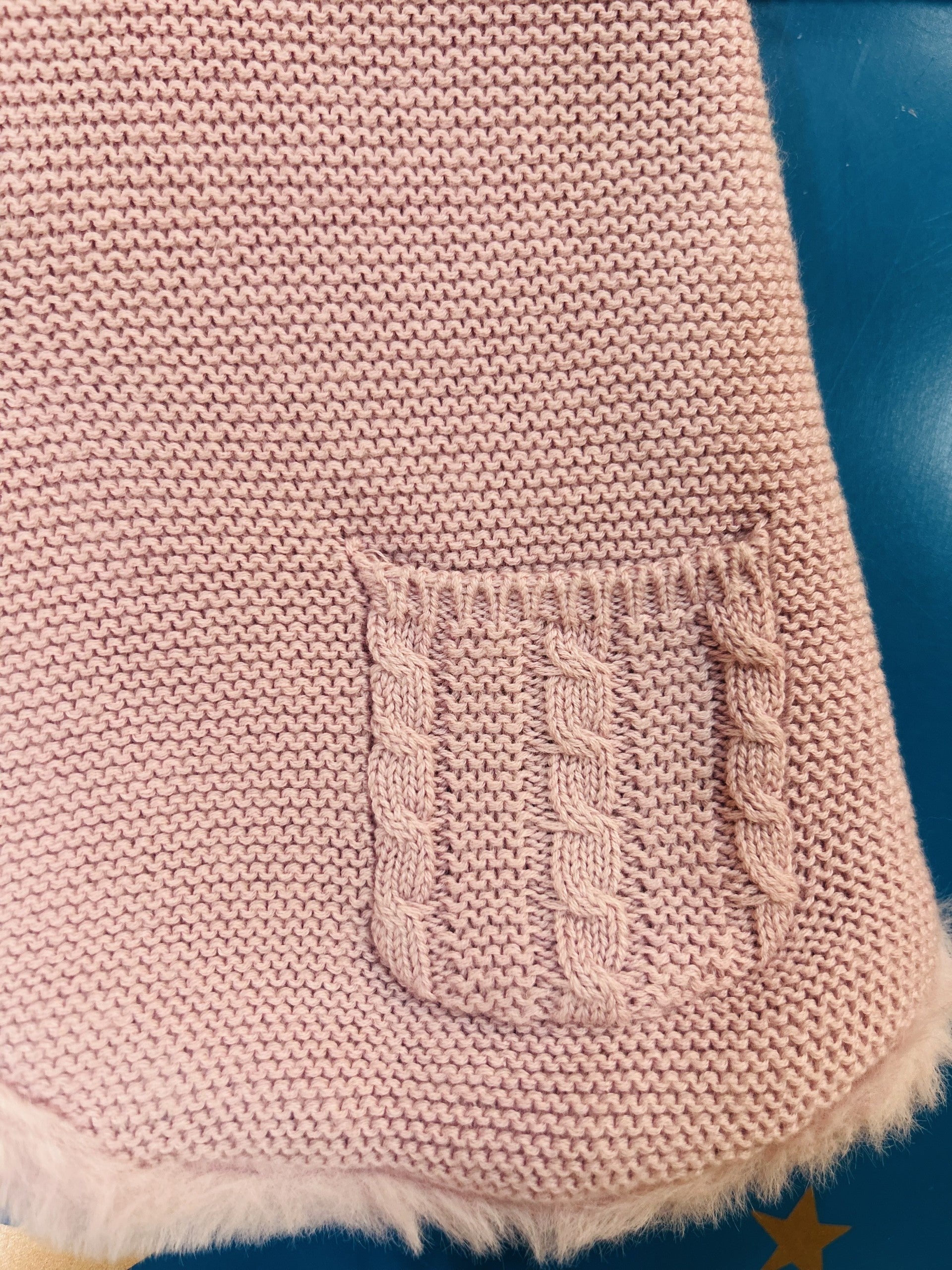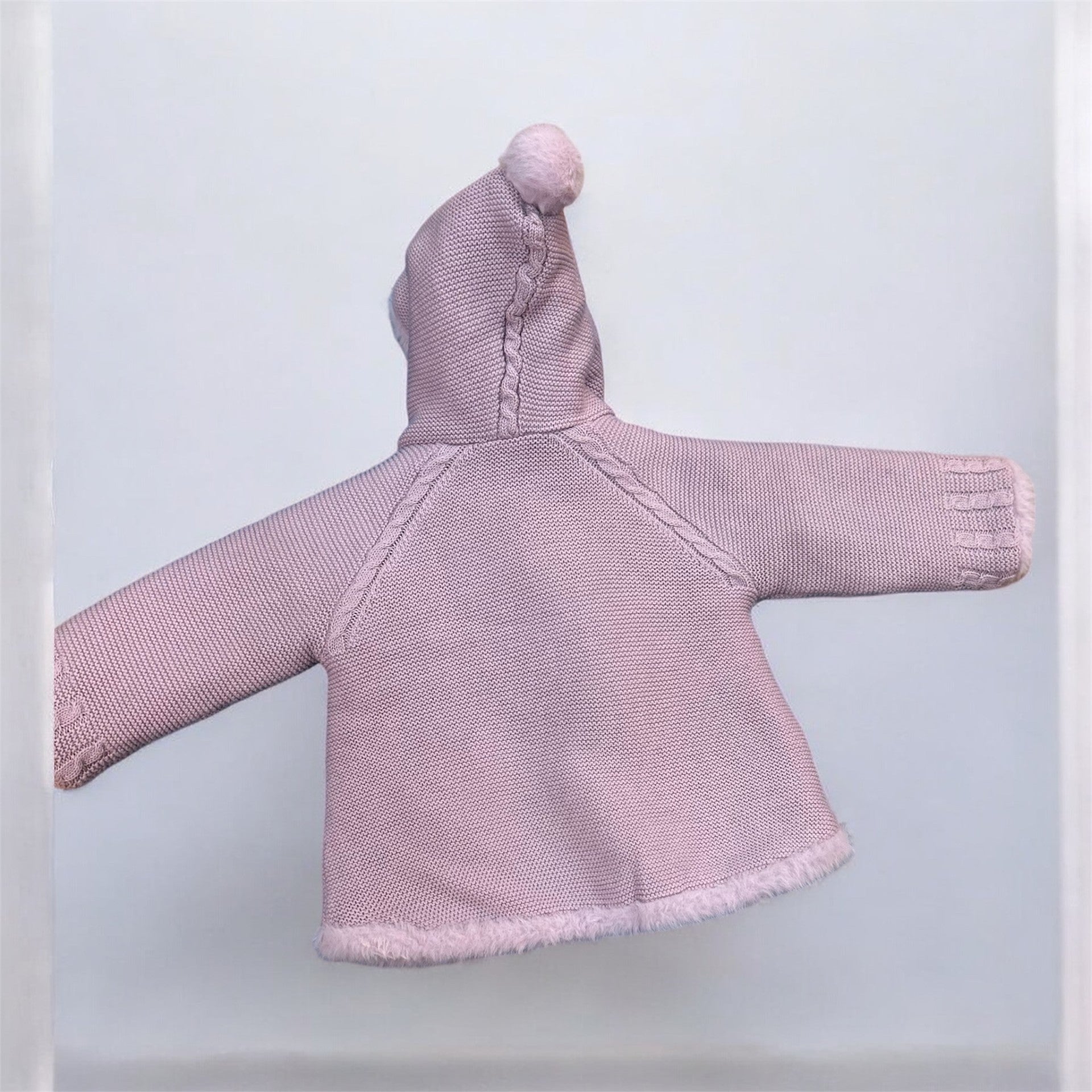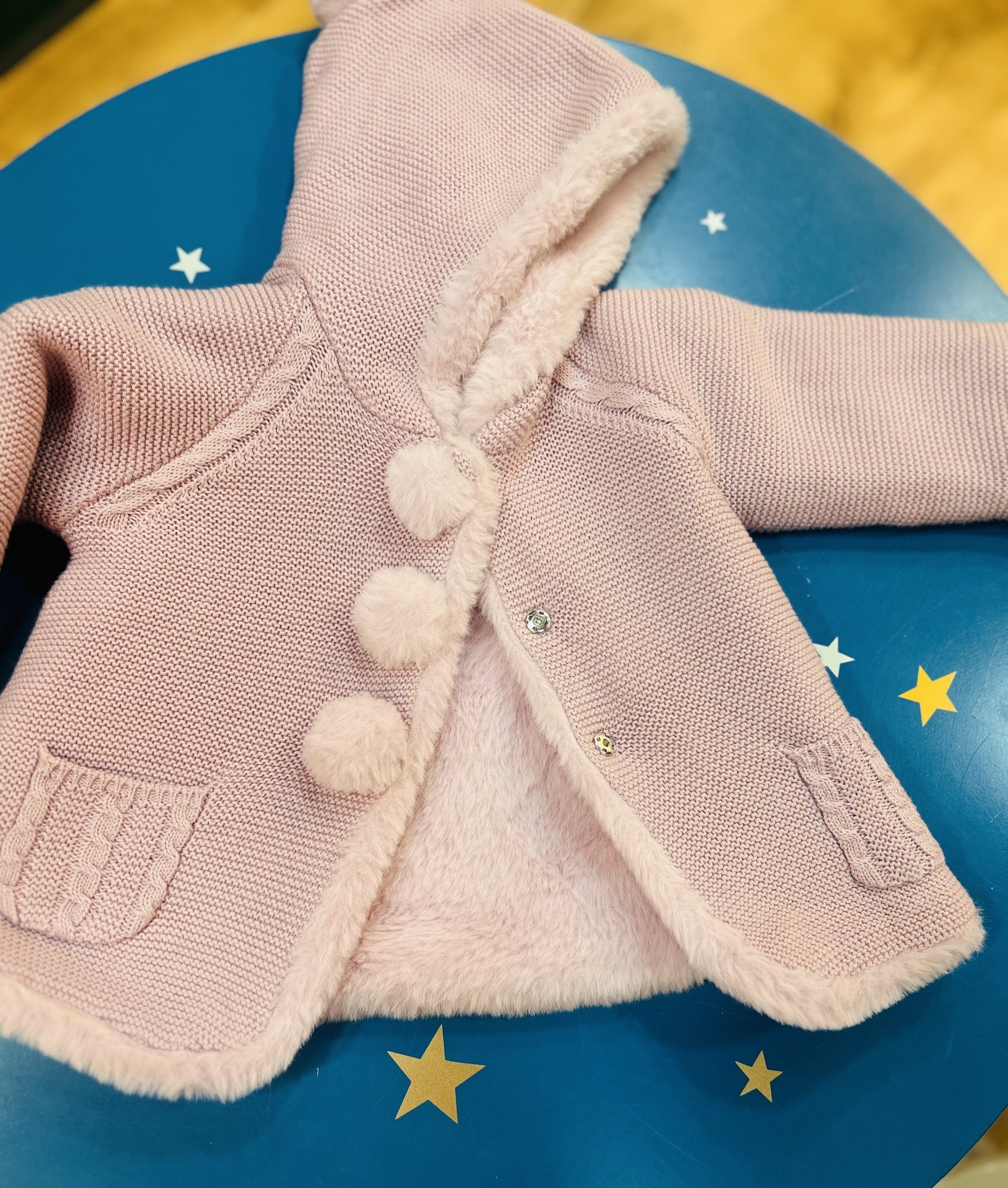Esterno in maglia intrecciata con dettagli treccia, interno completamente foderato in eco pelliccia soffice, e grandi bottoni a pon pon che aggiungono un tocco tenerissimo.