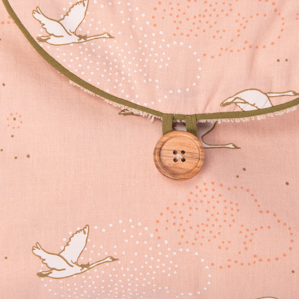 Realizzato in morbido tessuto certificato OEKO-TEX®, presenta un delicato motivo con cigni danzanti su fondo rosa cipria, ispirato all’atmosfera poetica della collezione La Petite École de Danse.