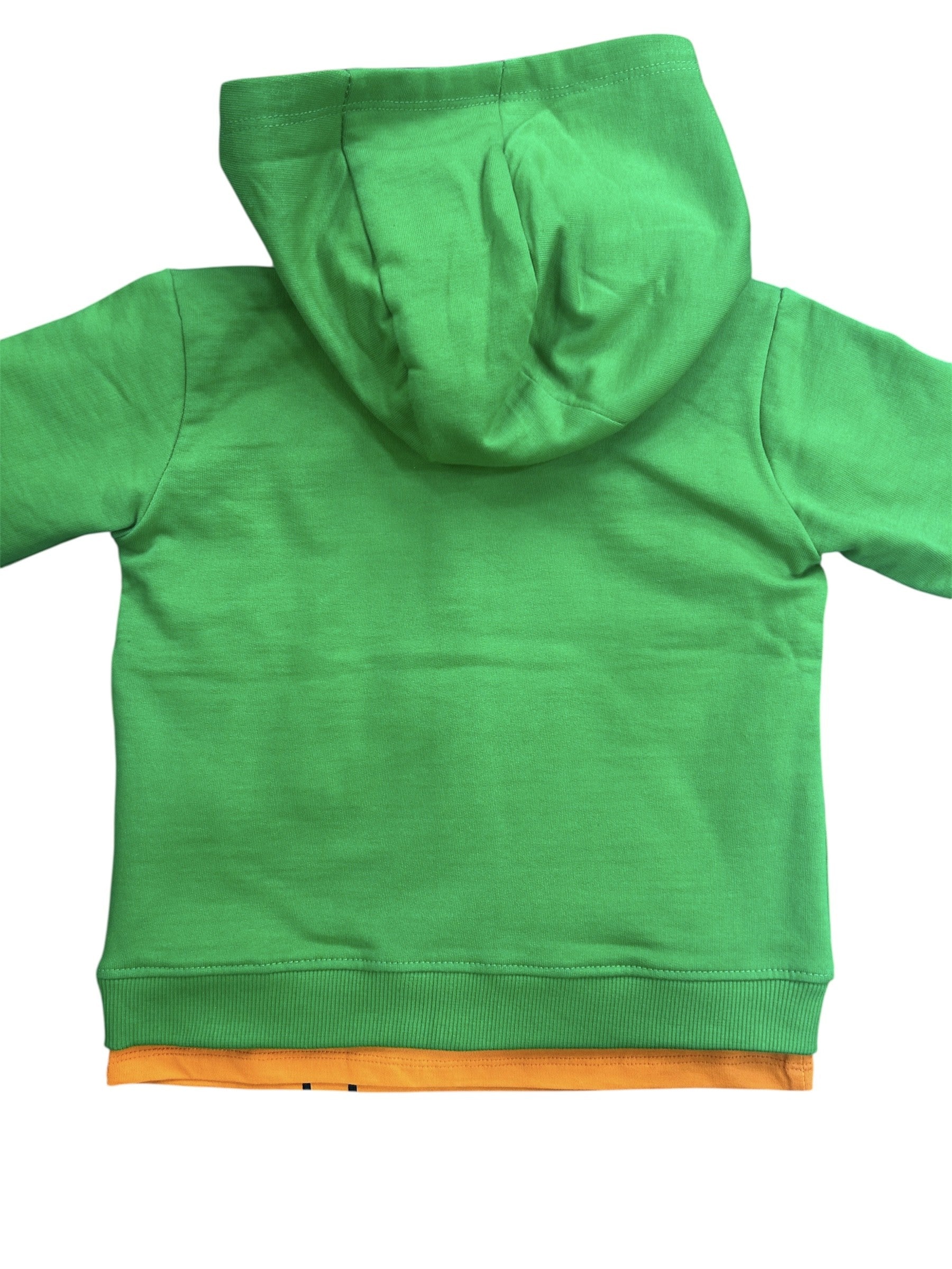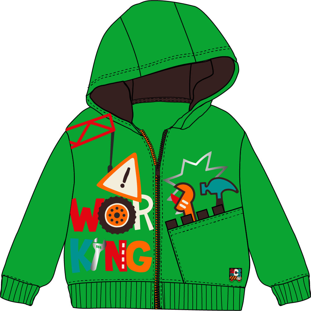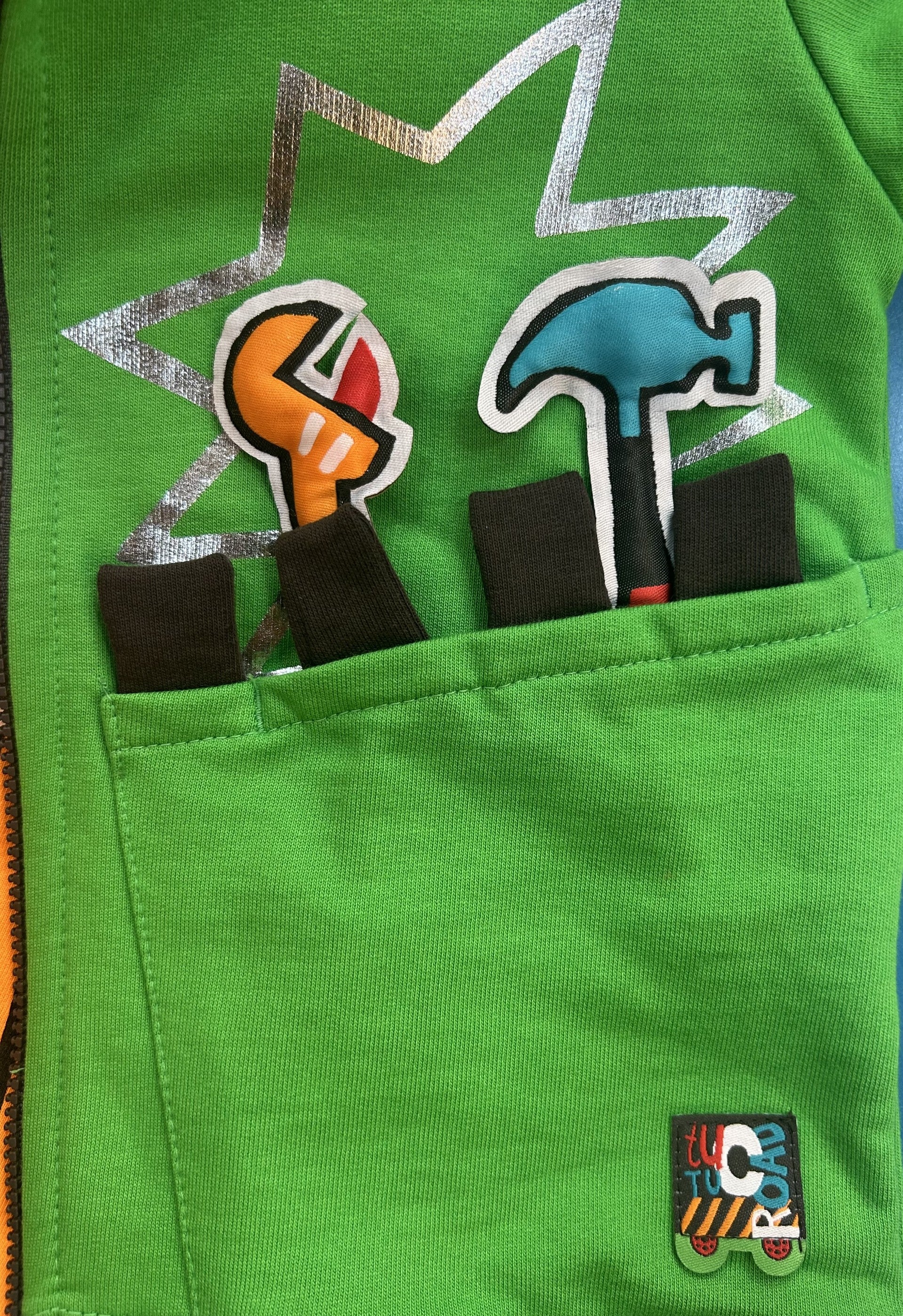 Una felpa pratica e allegra che diventa subito il capo preferito dei bambini! In un vivace verde acceso, è arricchita da stampe colorate a tema attrezzi e dettagli brillanti che la rendono unica.