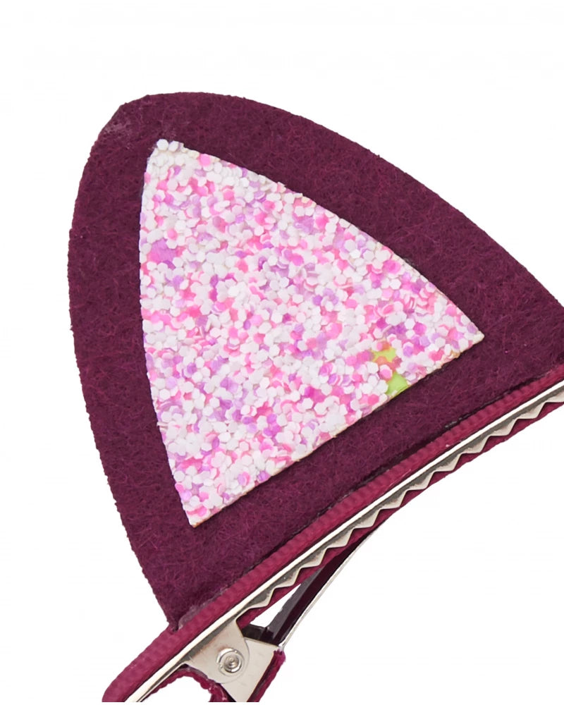 Coppia di fermagli per bambina a forma di orecchie, realizzati in morbido feltro color vinaccia con interno decorato in glitter multicolor sui toni del rosa.