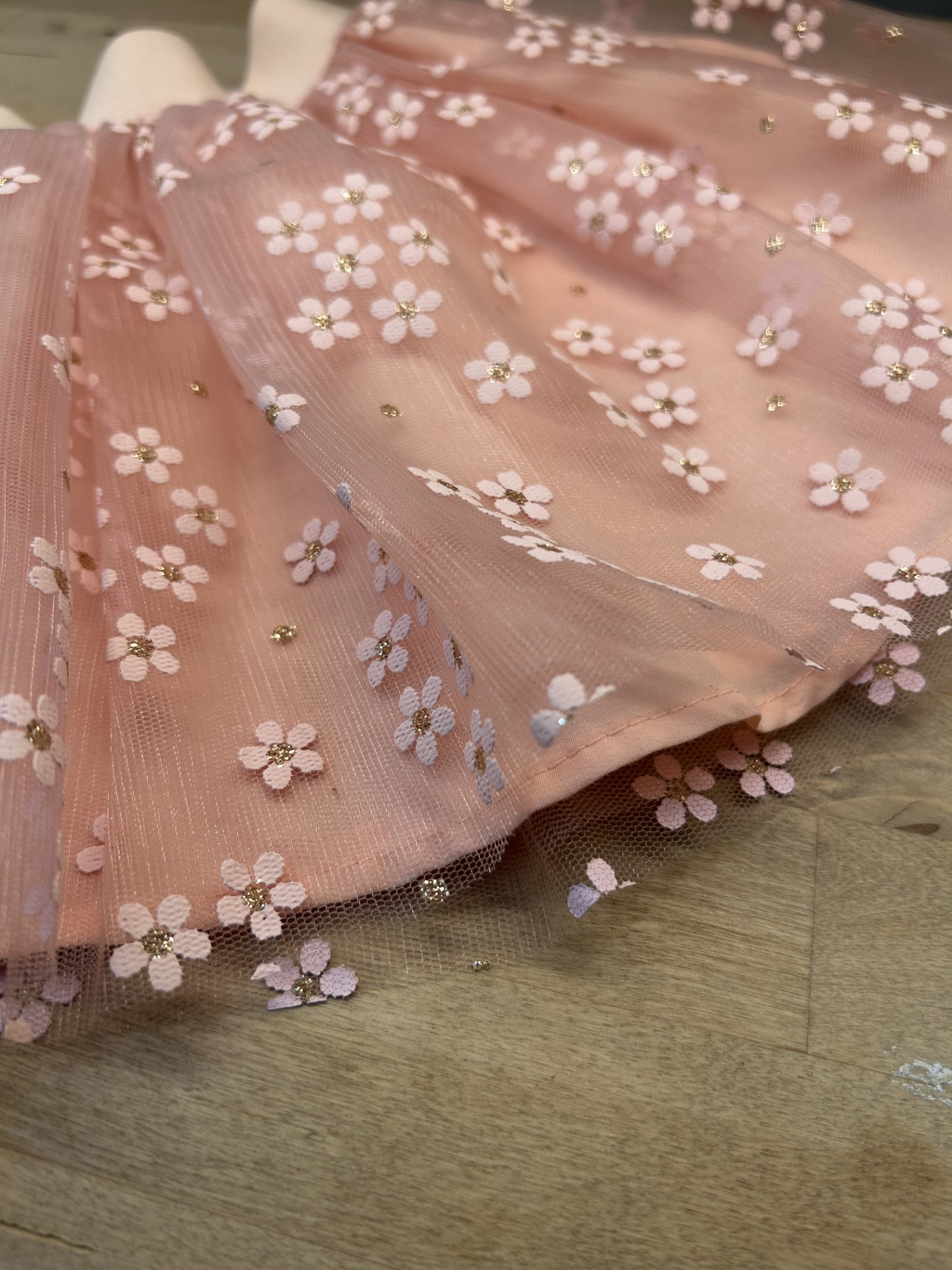 Deliziosa gonnellina Mayoral in tulle ricamato con fiorellini rosa e tocchi dorati, con morbida fodera interna in cotone leggero color pesca.