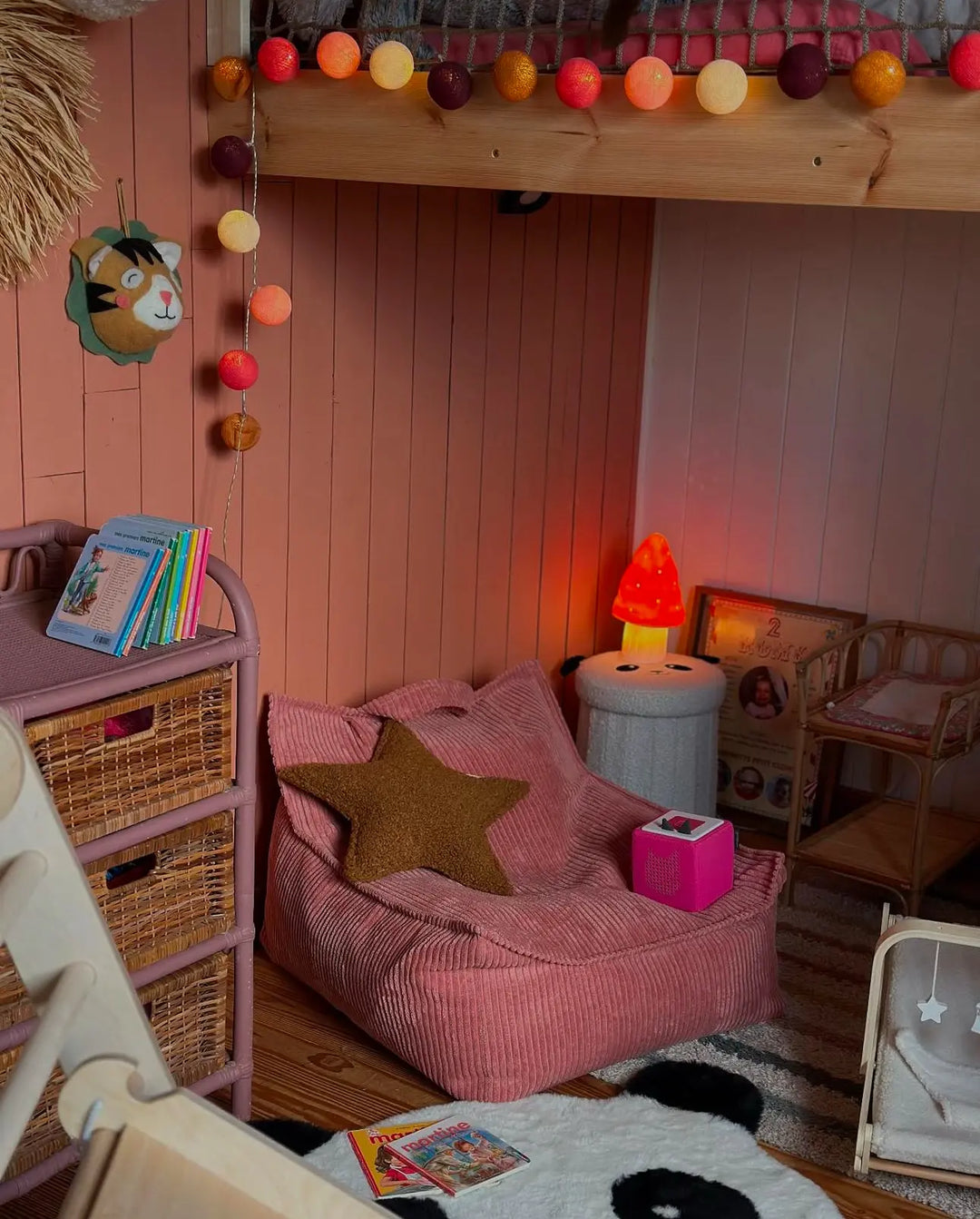 Le piccole dita scoprono qualcosa di incantato: un funghetto luminoso che diffonde una luce calda e avvolgente, trasformando ogni spazio in un piccolo bosco dei sogni.