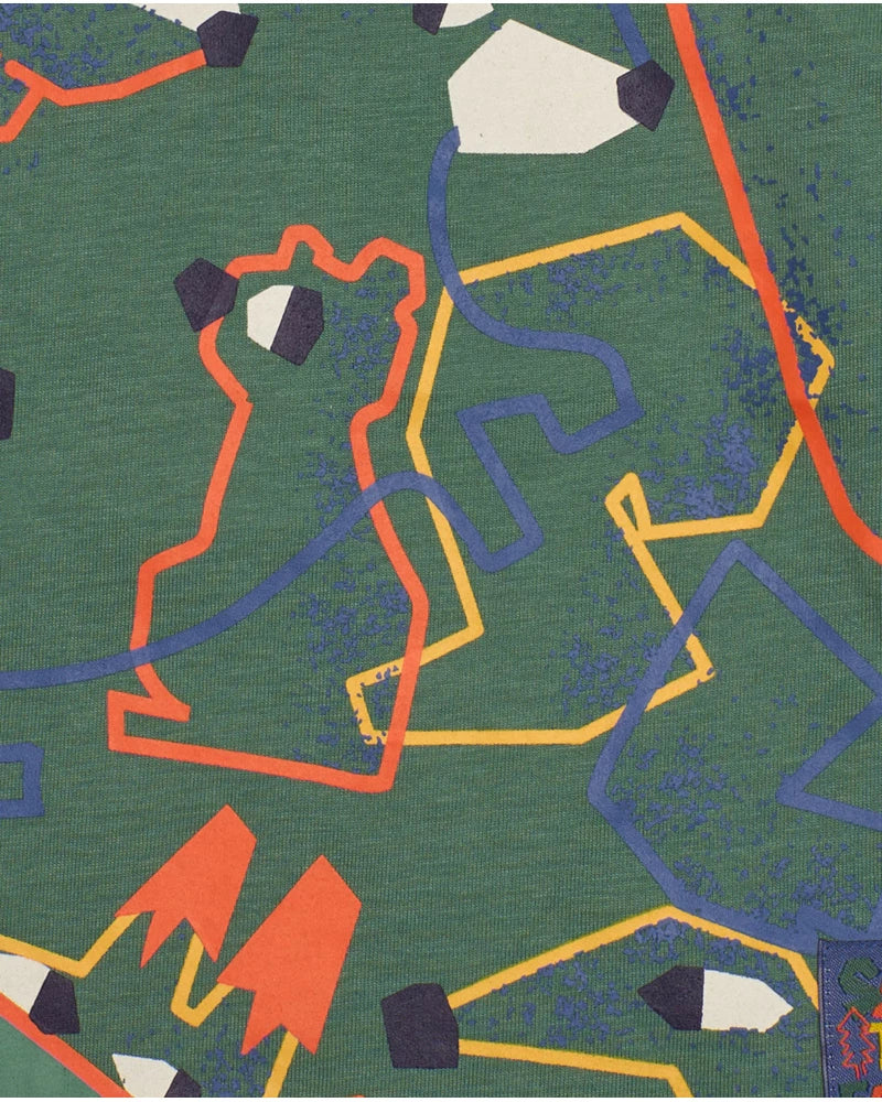 Una maglietta che unisce stile e comfort: realizzata in 100% cotone morbido. La stampa geometrica raffigura diversi animali – volpi, orsi e scoiattoli – in vivaci tonalità di arancione, giallo e blu, regalando un tocco originale e divertente, perfetto per chi ama distinguersi anche nei piccoli dettagli.